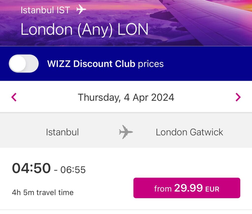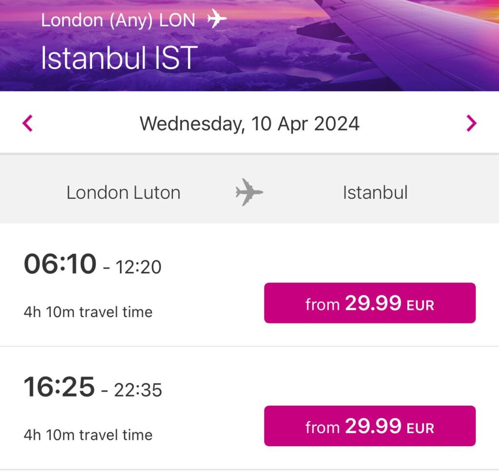 Avrupa’nın Low Lost havayolu firması WizzAir’in direkt İstanbul Londra uçuşları var. WizzAir gibi Avrupa için low-cost havayolu firmalarında herhangi bir kampanya beklemeden çok uygun uçuşlar bulmak mümkün. İstanbul-Londra arasında birçok tarihte gidiş dönüş için ortalama 60 Euro’ya bilet bulabilirsiniz. Aşağıdaki örneğimizde İstanbul – Londra tek yön 30 Euro, gidiş dönüş 60 Euro. Buna ek olarak diğer tüm tarih alternatiflerini de sizler için sıraladık.