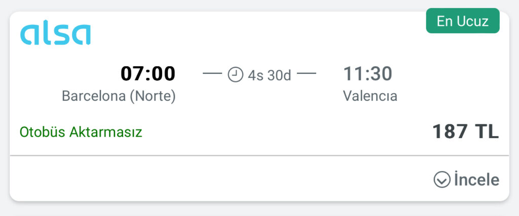 - Barcelona – Valencia: 22 Şubat’ta otobüs ile 187 TL. Otobüs firması İspanya içi seferler yapan Alsa firması. Kendi sitesinde ödeme adımında bazen hata verebiliyor. Bileti obilet sitesi üzerinden veya movelia sitesinden alabilirsiniz. Ekran görüntüsü obilet sitesinden.