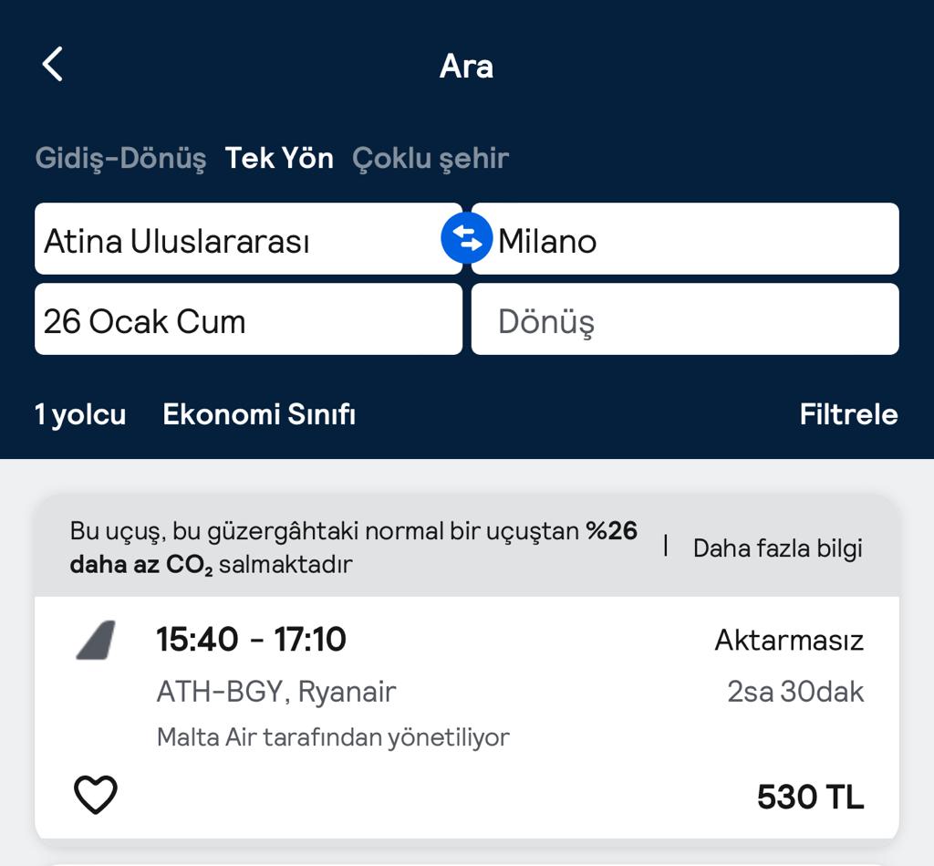 • Atina – Milano: 26 Ocak’ta Ryanair ile 530 TL. Bu bileti Skyscanner’da aratabilir ya da doğrudan havayolu firmasının sitesinden alabilirsiniz.