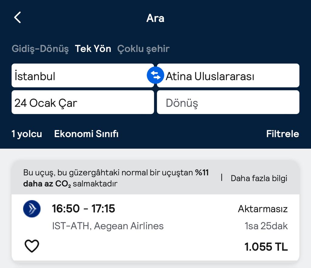 • İstanbul-Atina: 24 Ocak’ta Aegean Airlines ile 1055 TL. Bu bileti Skyscanner’da aratabilir ya da doğrudan havayolu firmasının sitesinden alabilirsiniz.