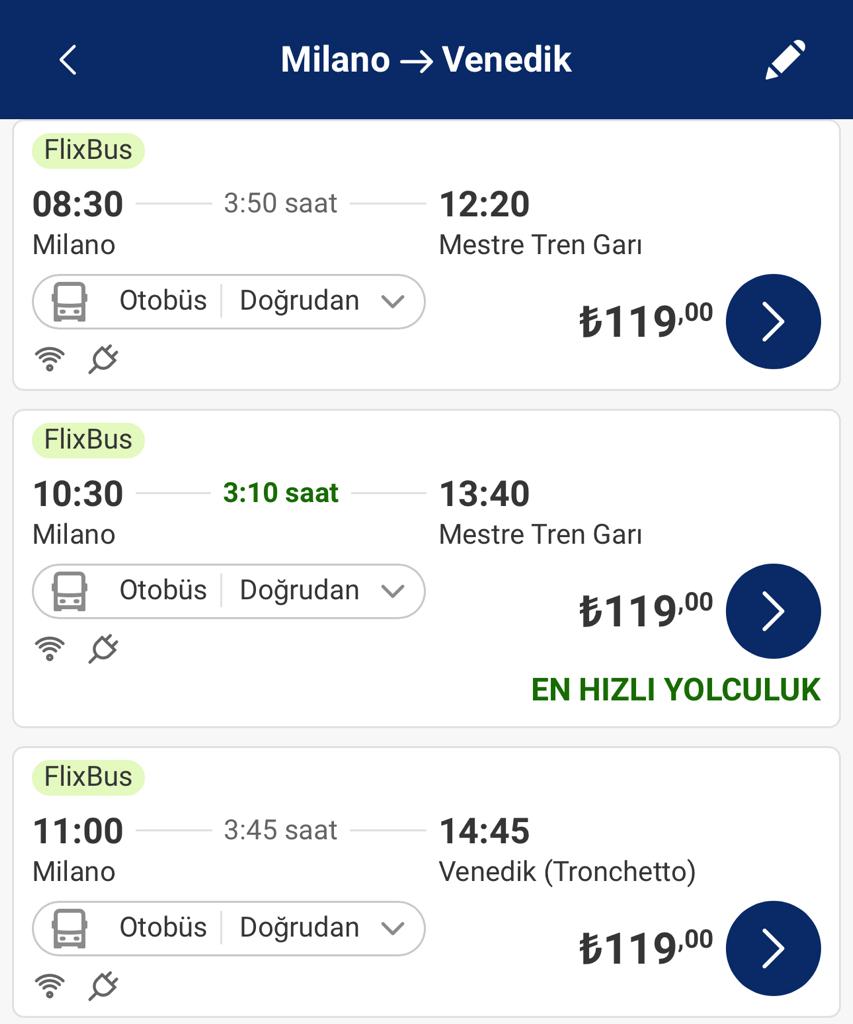 • Milano – Venedik: 28 Ocak’ta Flixbus ile 119 TL. Ayrıca Flixbus otobüs biletlerini Flixbus sitesinden daha ucuza KamilKoç’un sitesinden TL ile Türkçe site üzerinden alabilirsiniz.