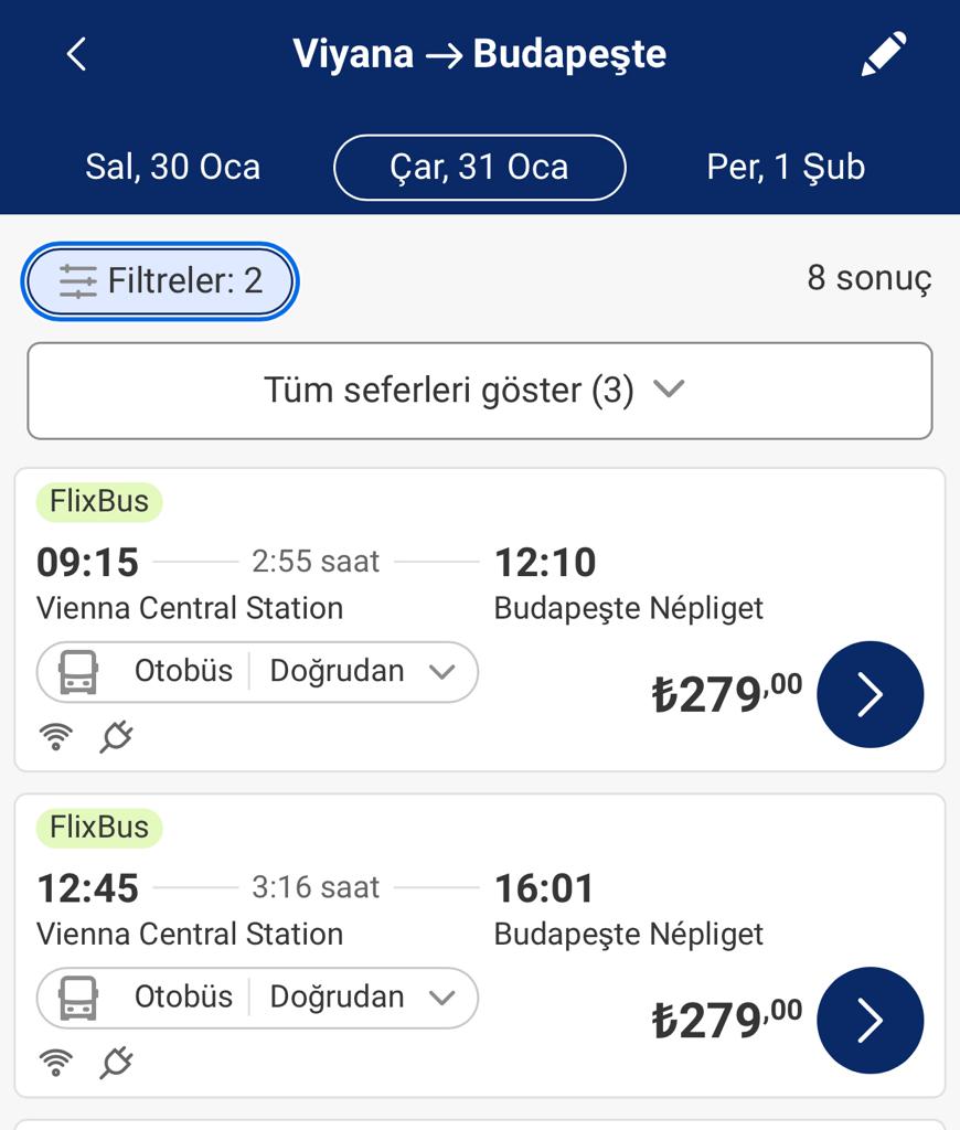 • Viyana – Budapeşte: 31 Ocak’ta Flixbus ile 279 TL. Flixbus otobüs biletlerini Flixbus sitesinden daha ucuza KamilKoç’un sitesinden TL ile Türkçe site üzerinden alabilirsiniz.