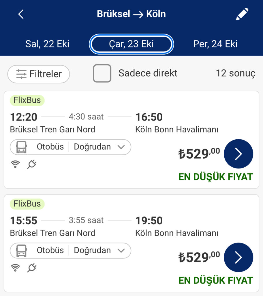 - Brüksel – Köln: 23 Ekim’de Flixbus ile 529 TL. Biletlerinizi Flixbus / Kamil Koç sitesinden alabilirsiniz. Bunun için Link: https://www.kamilkoc.com.tr/