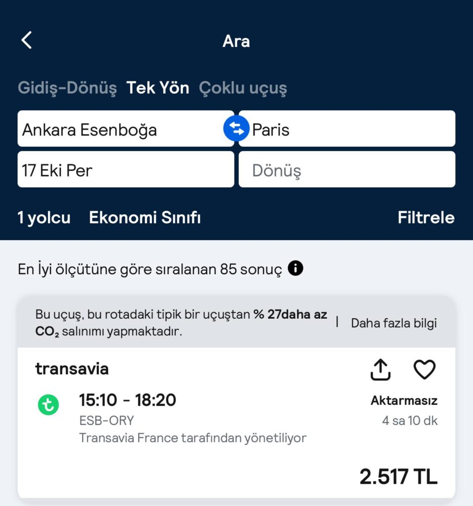 - Ankara – Paris: 17 Ekim’de Transavia ile 2517 TL. Biletlerinizi Transavia sitesinden alabilirsiniz. Bunun için Link: https://www.transavia.com/