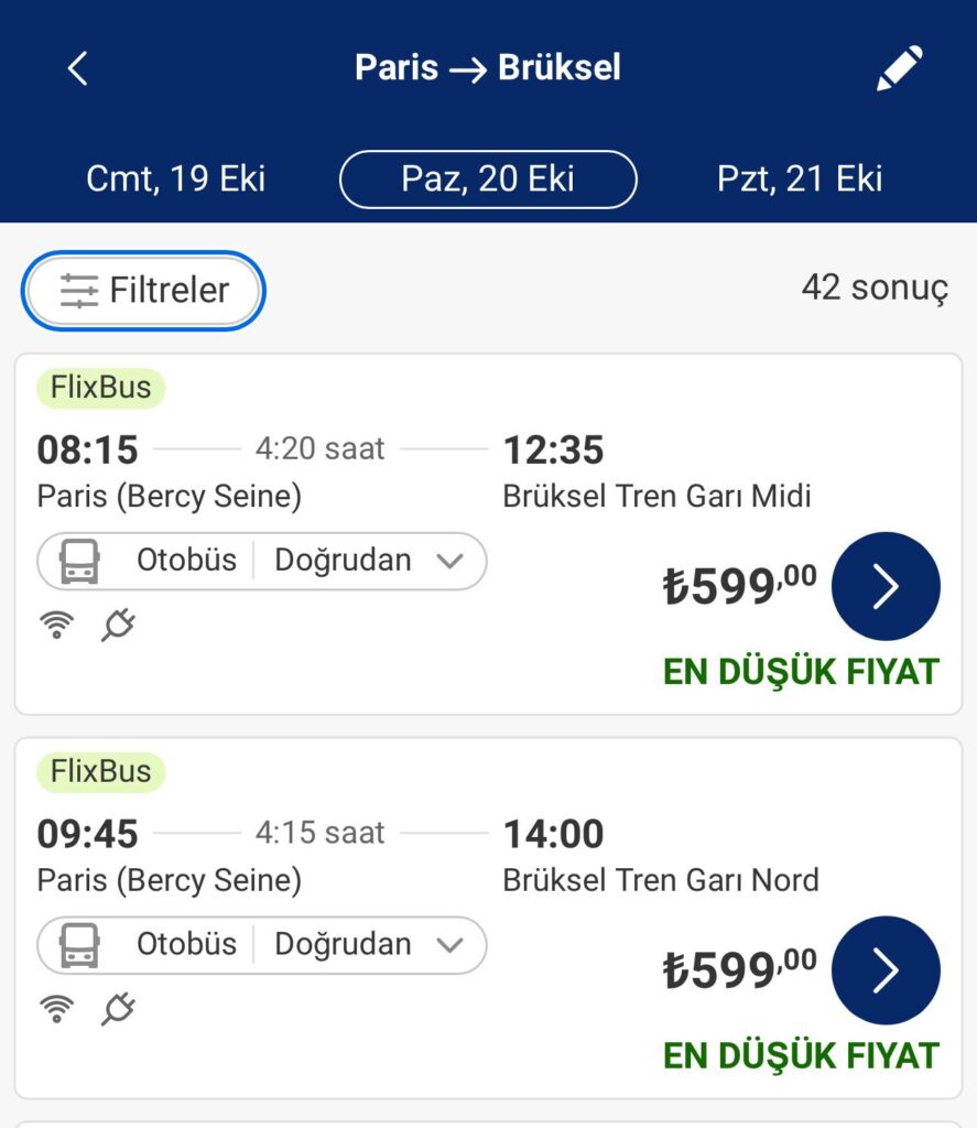 - Paris – Brüksel: 20 Ekim’de Flixbus ile 599 TL. Biletlerinizi Flixbus / Kamil Koç sitesinden alabilirsiniz. Bunun için Link: https://www.kamilkoc.com.tr/