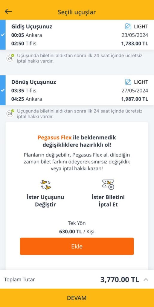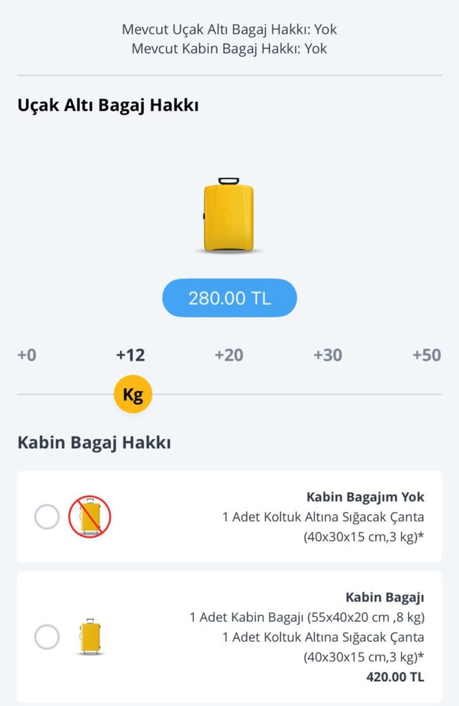 • Bu fiyata sadece 3 kg el bagajı dahil olduğu için ek bagaj eklemeniz gerekli. Light paket seçiminden sonra bagaj adımında en uygun seçenek olarak 12 kg uçak altı bagaj seçeneğini +280 TL ye ayrı ayrı hem gidiş hem dönüş için ekleyemelisiniz. (toplamda 560 TL)