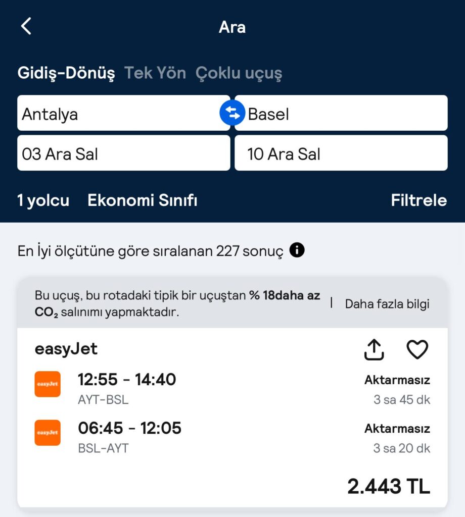 Antalya – Basel gidiş dönüş 2443 TL fiyat ile bir örnek tarih paylaşıyorum. Ayrıca farklı uygun fiyatlı alternatif tarih seçeneklerini de sizler için sıraladık.