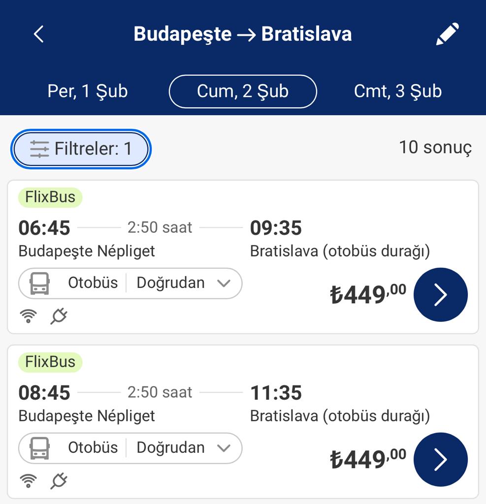 - Budapeşte – Bratislava: 2 Şubat’ta Flixbus ile 449 TL (13.5 Euro).